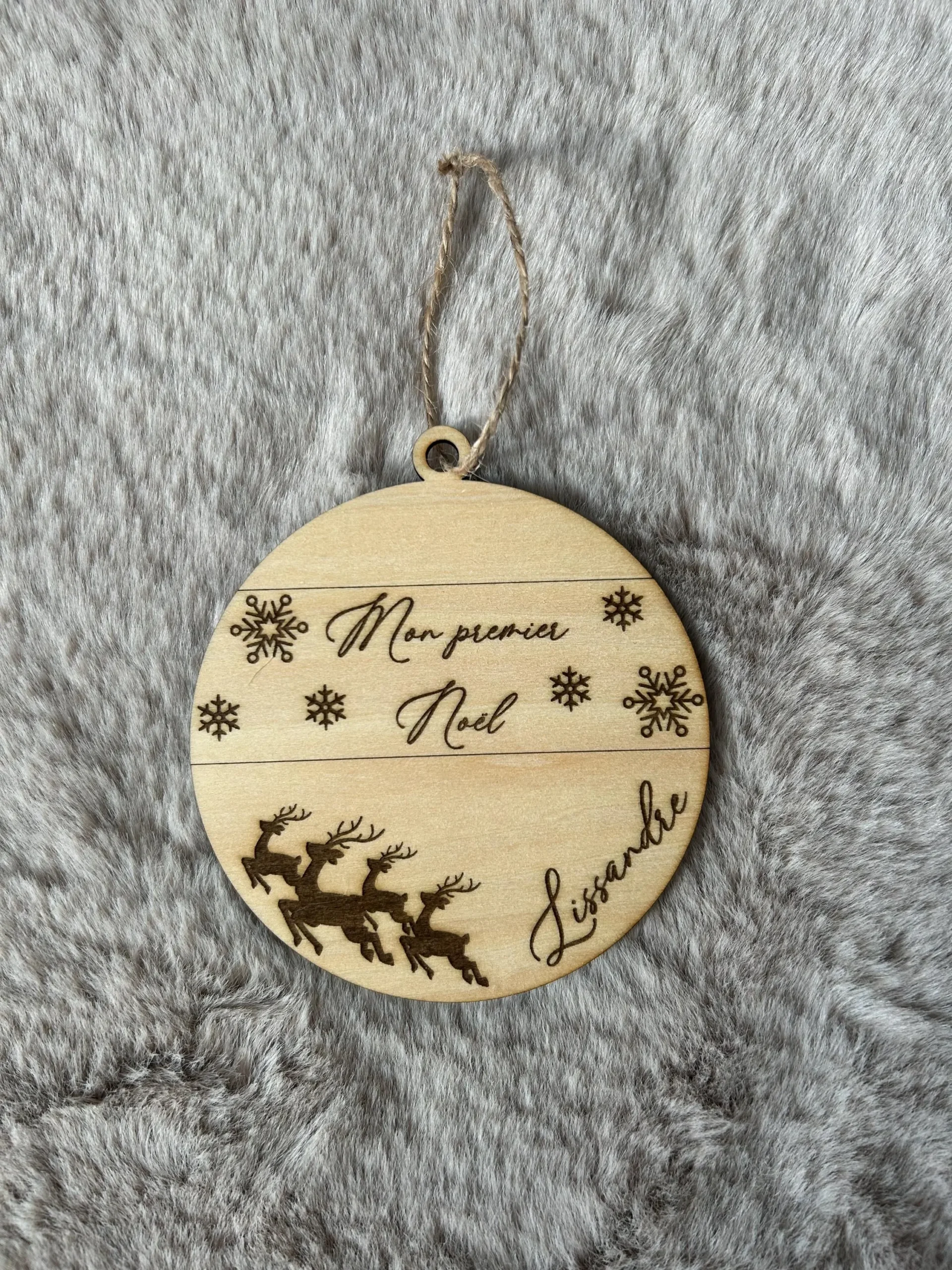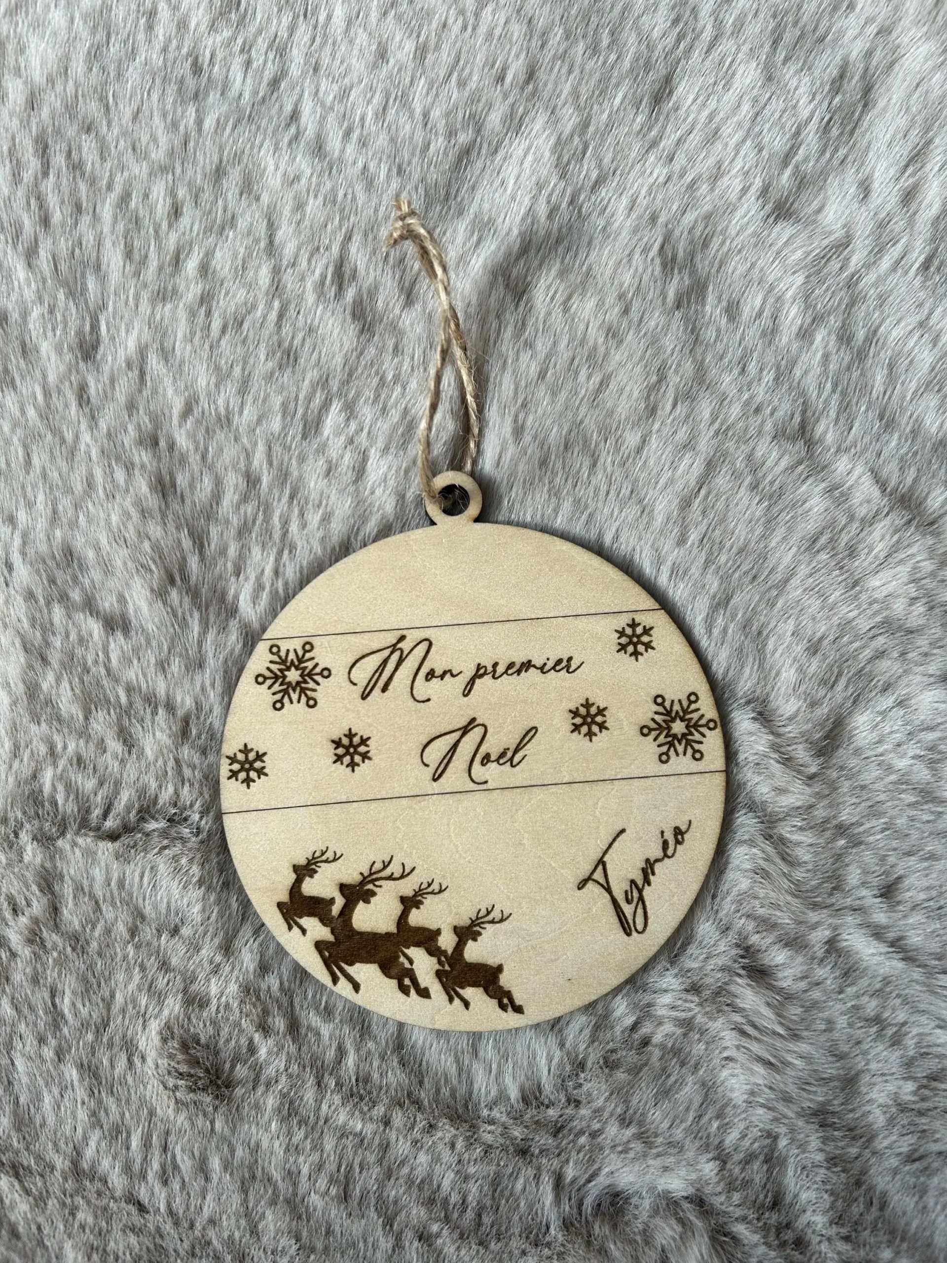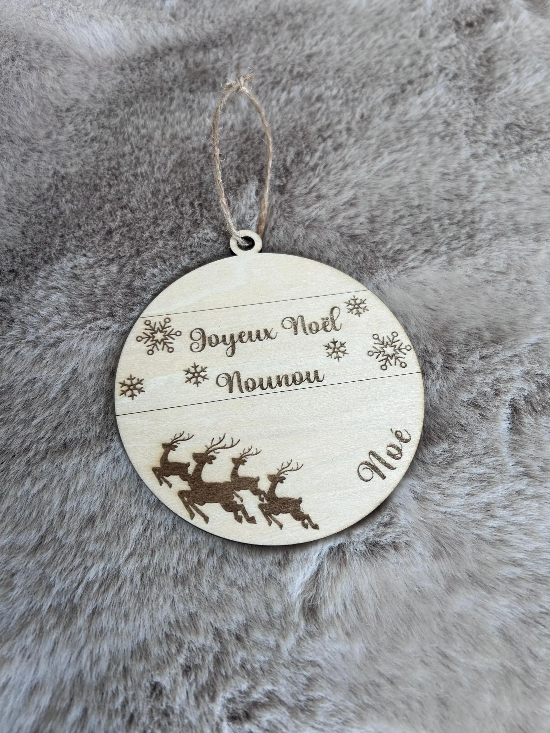 Très jolie boule de Noël personnalisé avec des motifs de rennes ainsi que des flocons de neige qui sont gravés sur du bois contreplaqué de Tilleul.