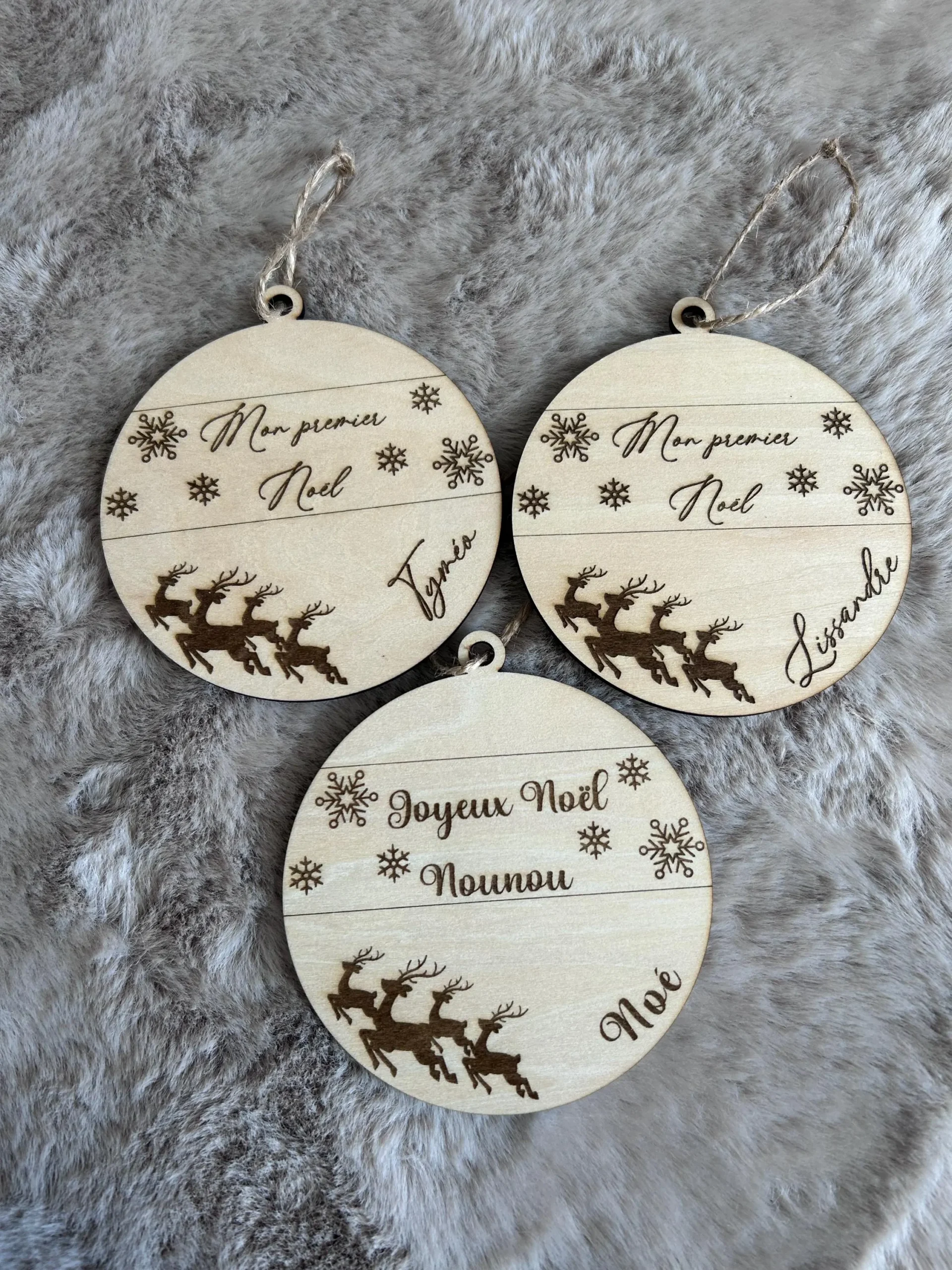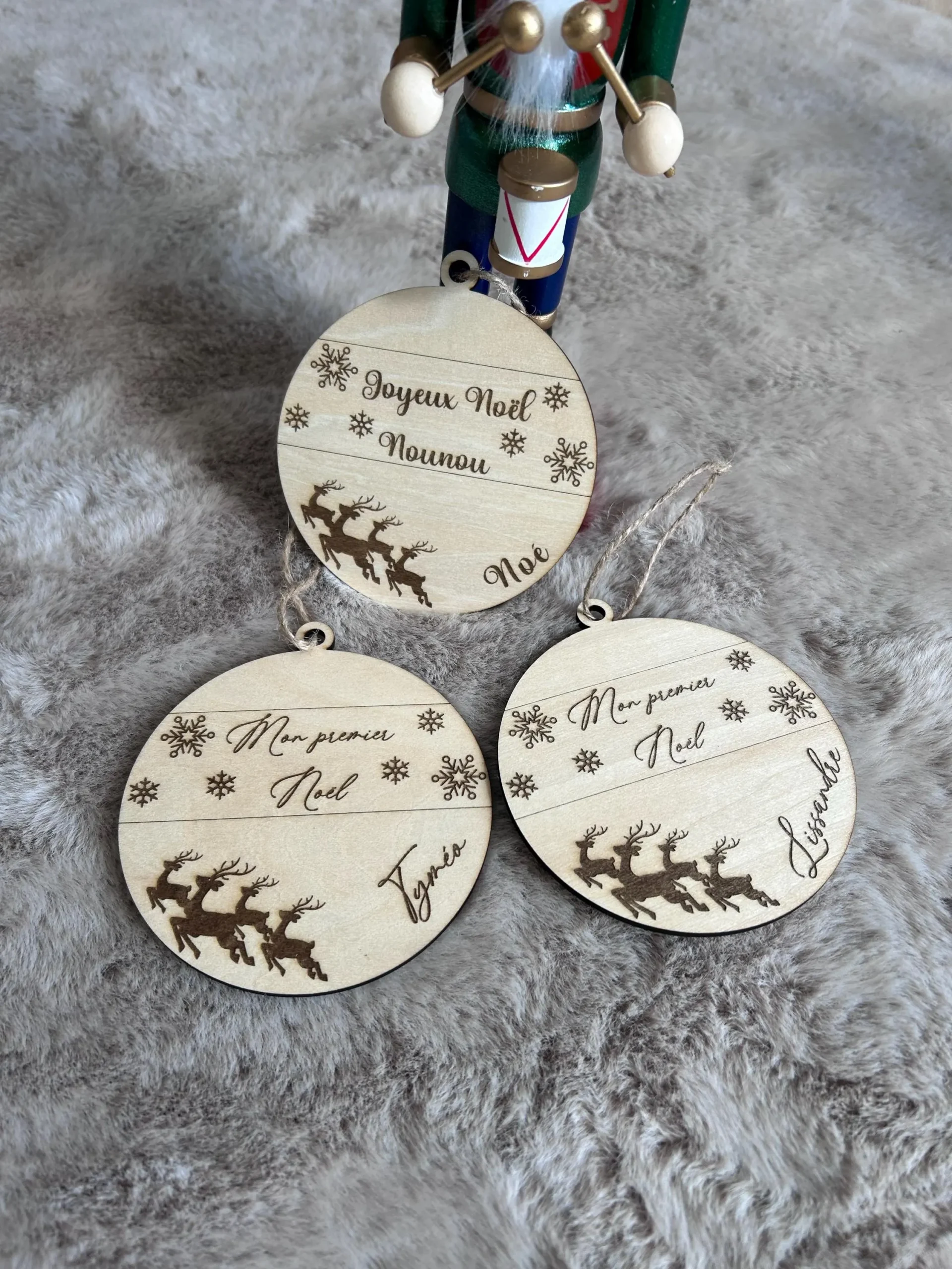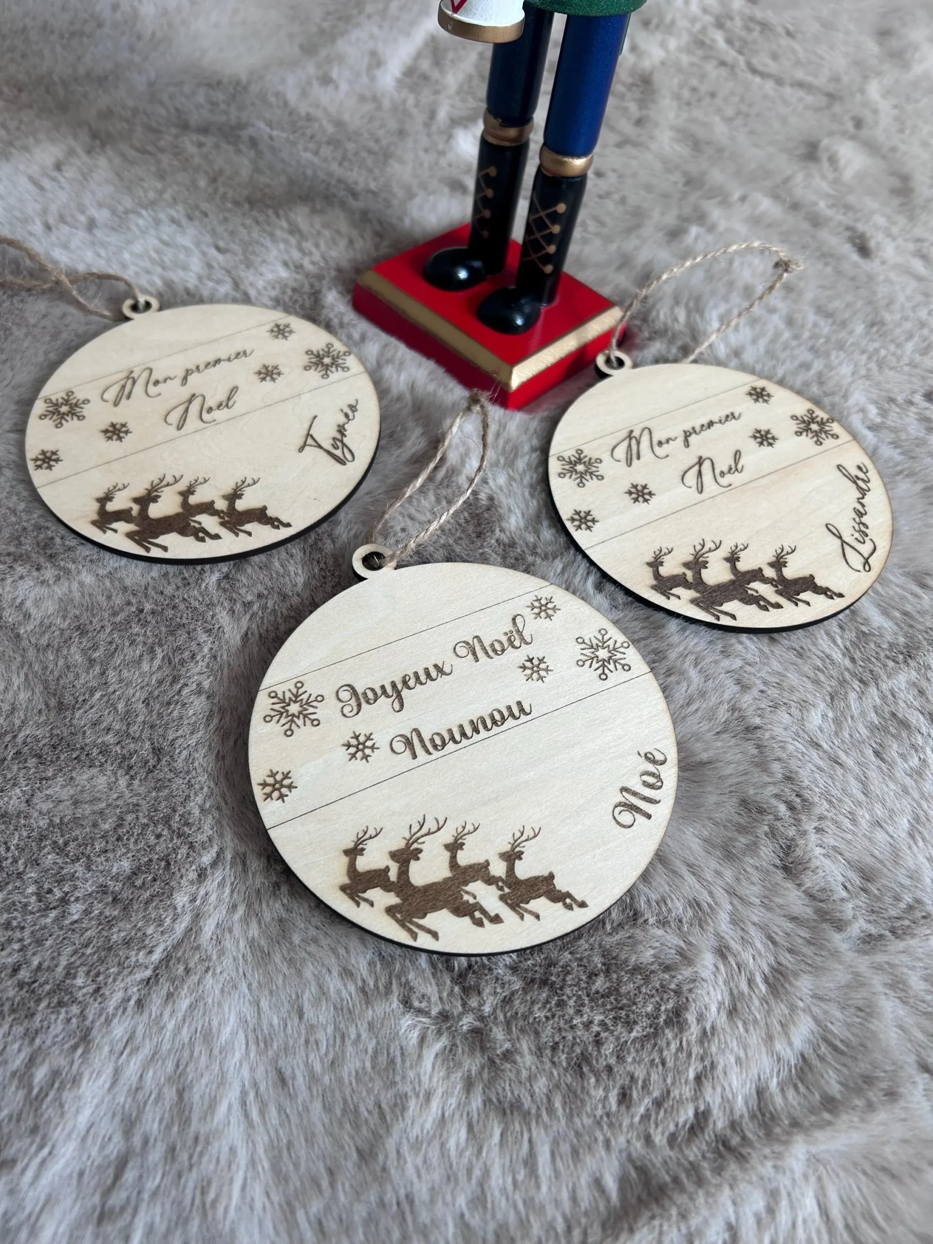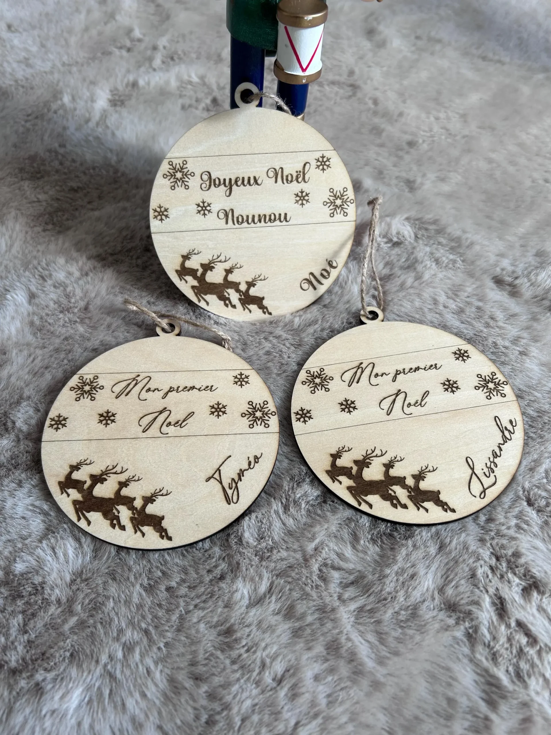 Très jolie boule de Noël personnalisé avec des motifs de rennes ainsi que des flocons de neige qui sont gravés sur du bois contreplaqué de Tilleul.