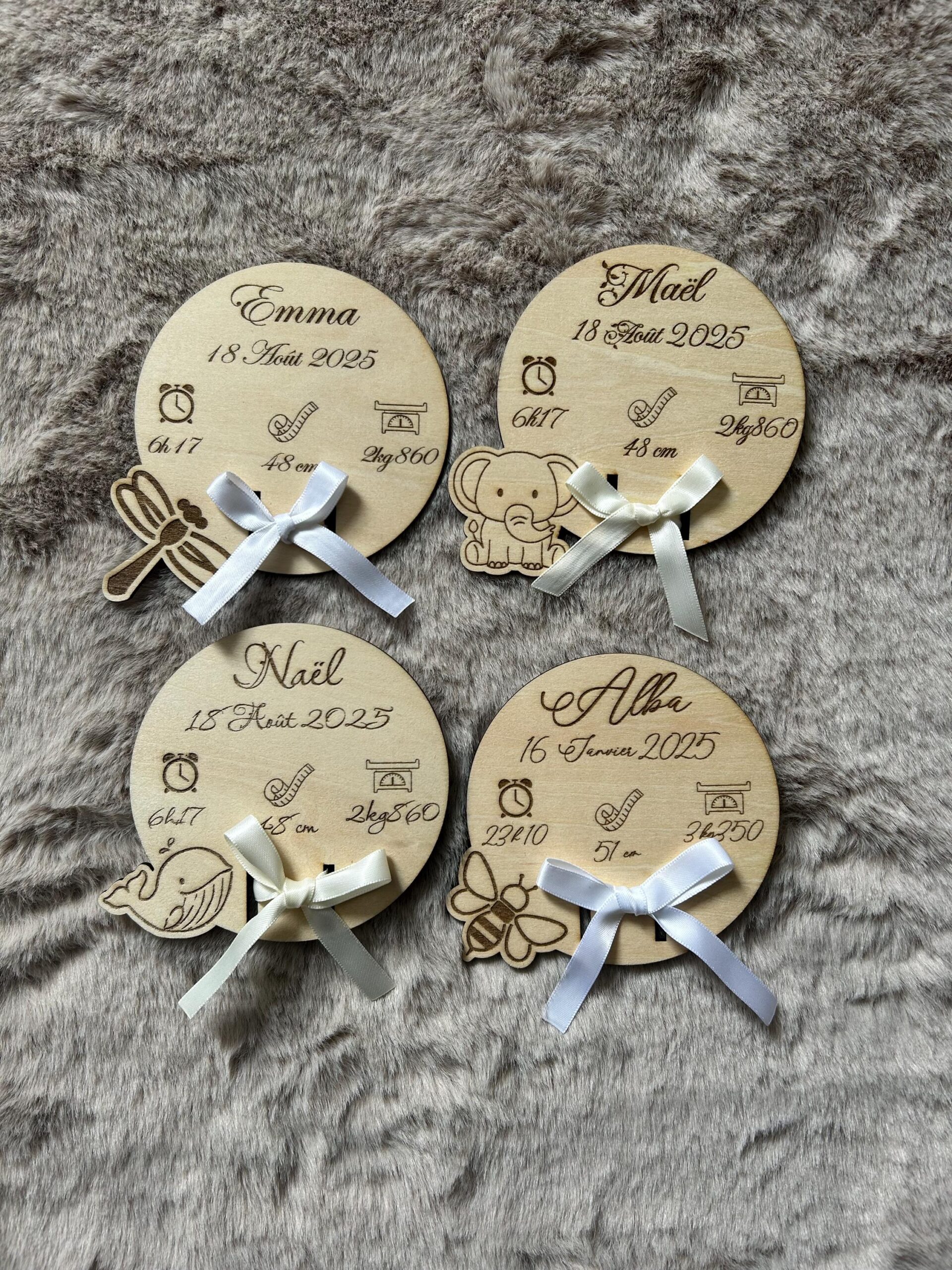 Carte en bois pour bracelet de naissance personnalisé avec le prénom et la date de naissance.