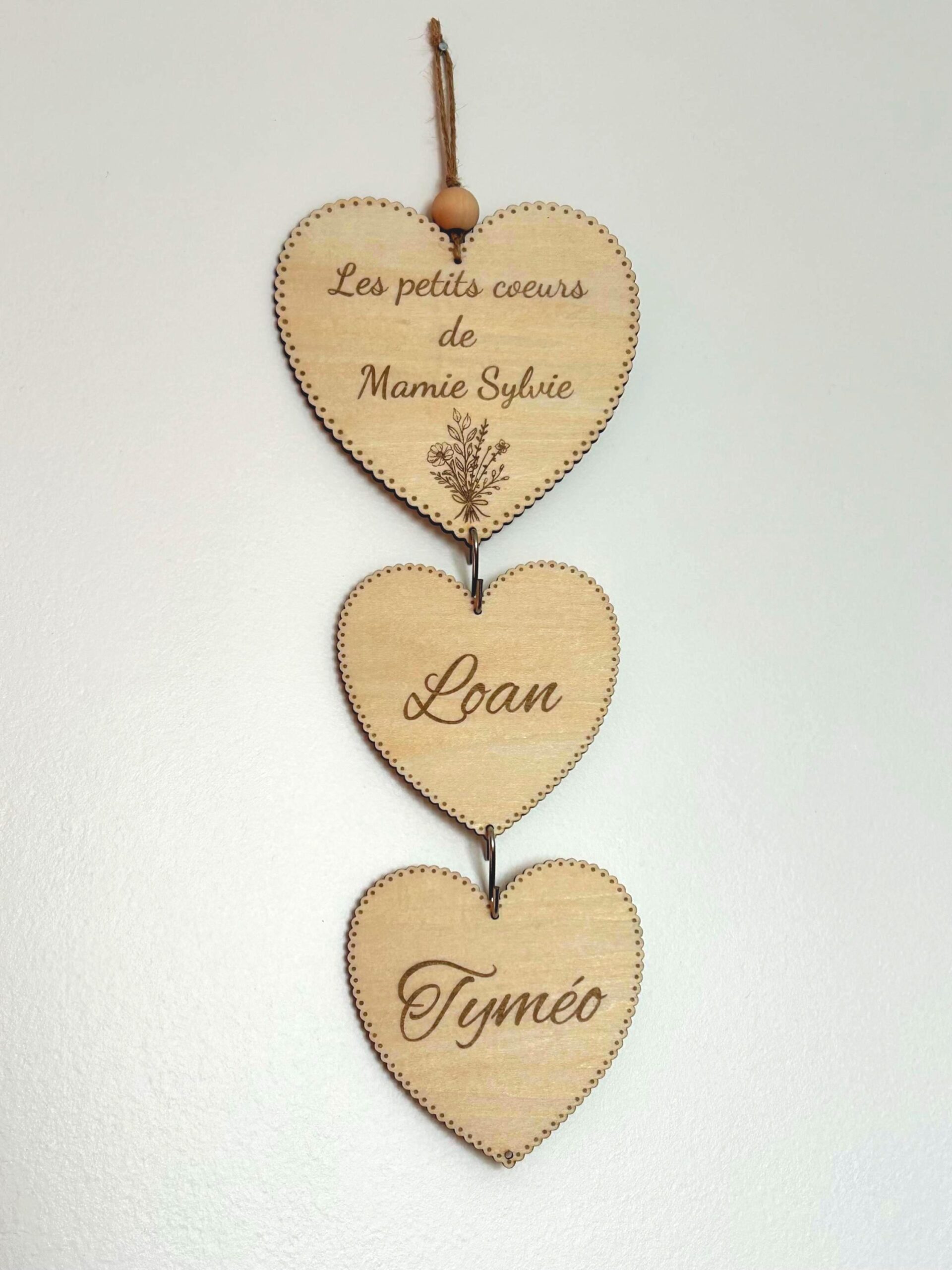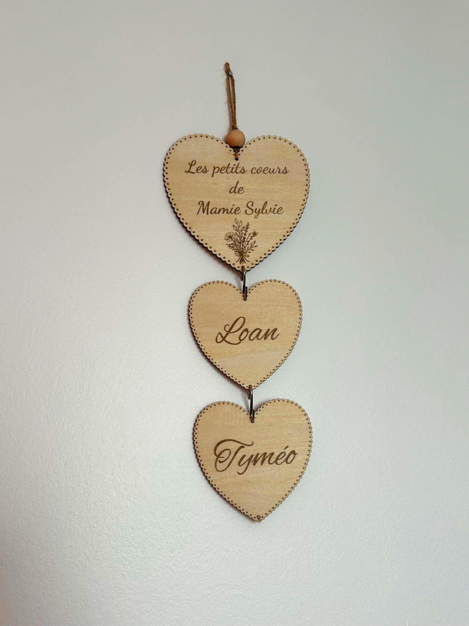 ❤️ Design : 3 cœurs suspendus, personnalisables avec les prénoms de votre choix.