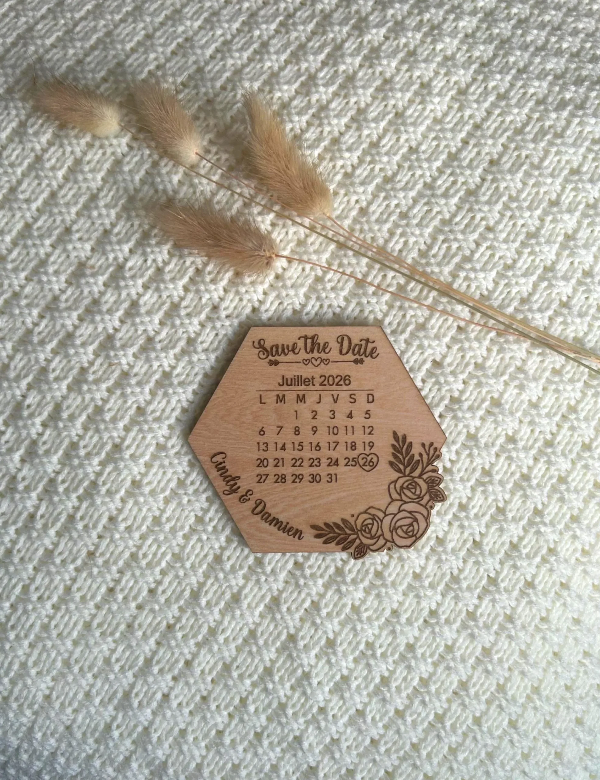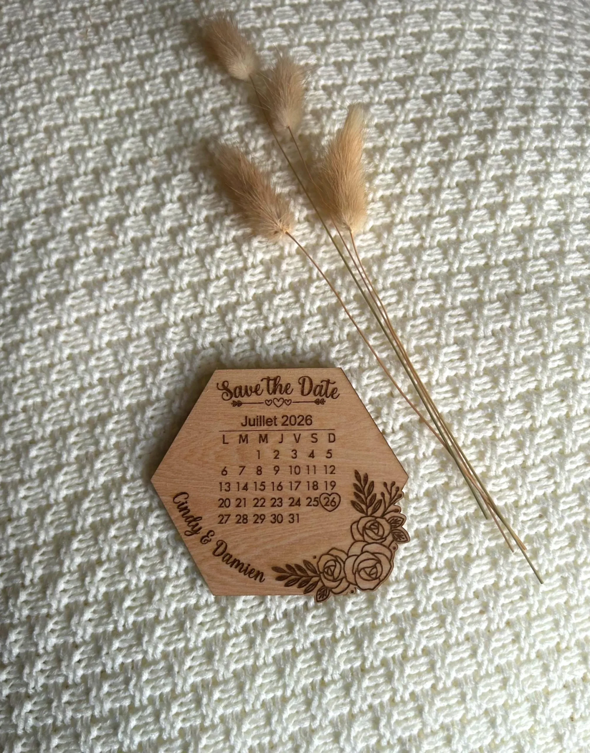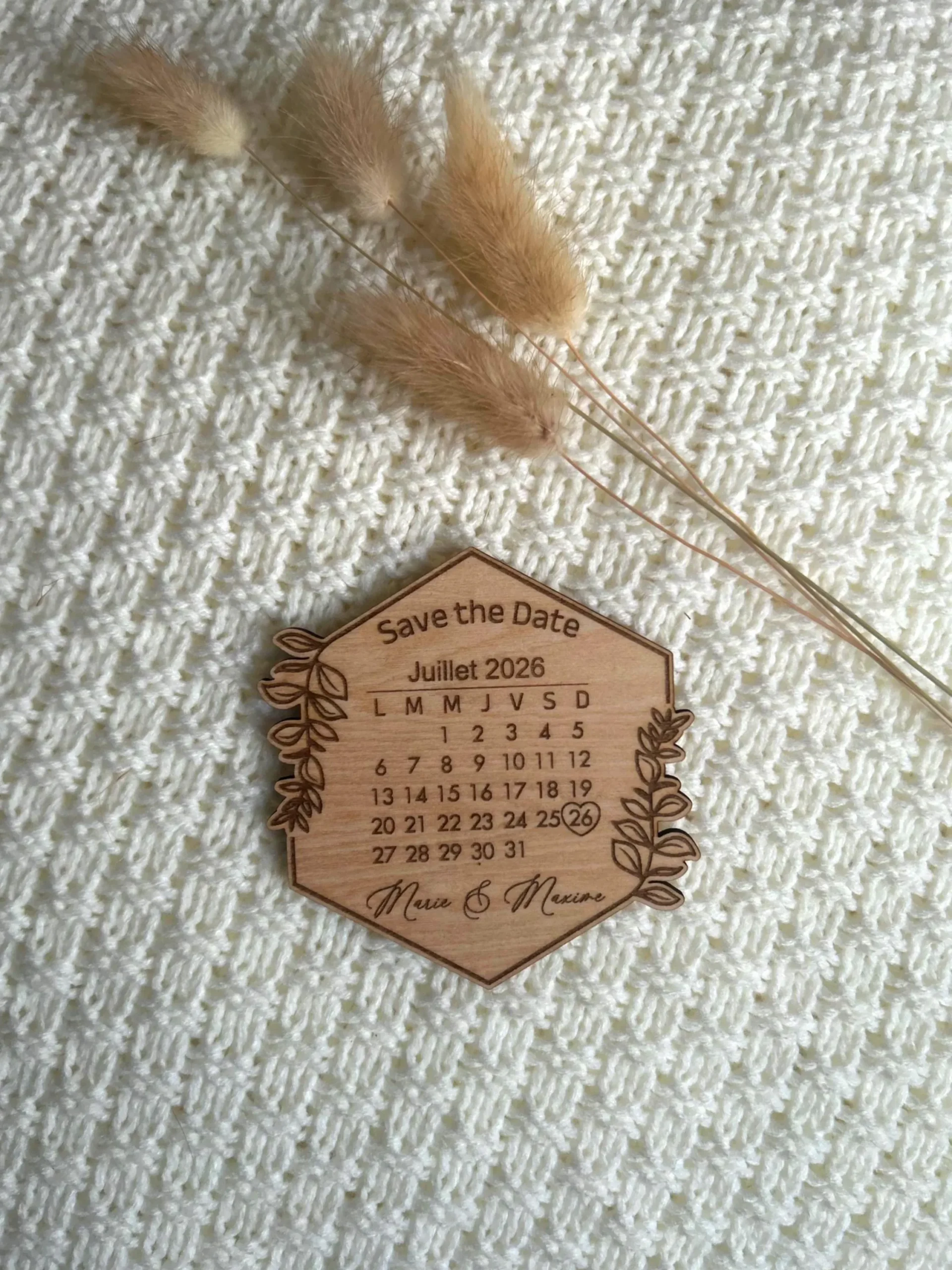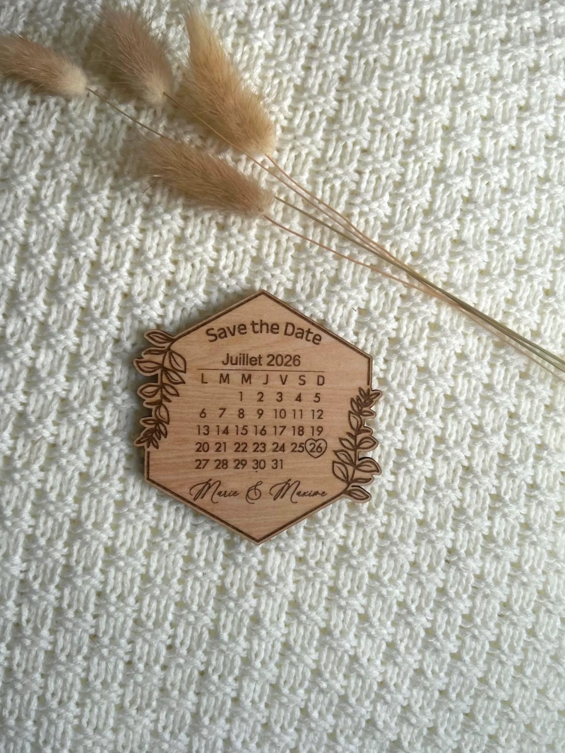 Annoncez votre mariage avec élégance grâce à nos magnets Save the Date en bois gravé.