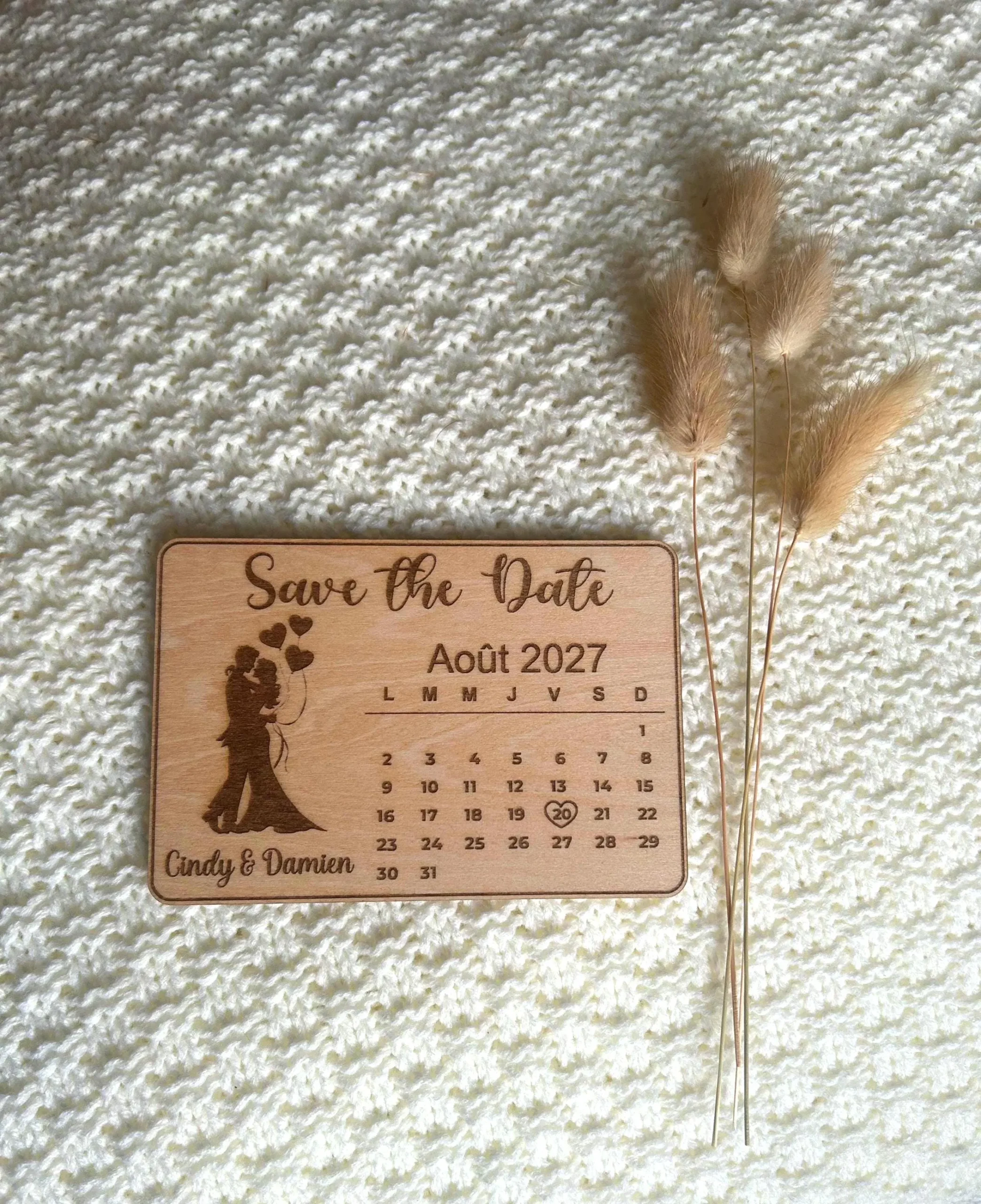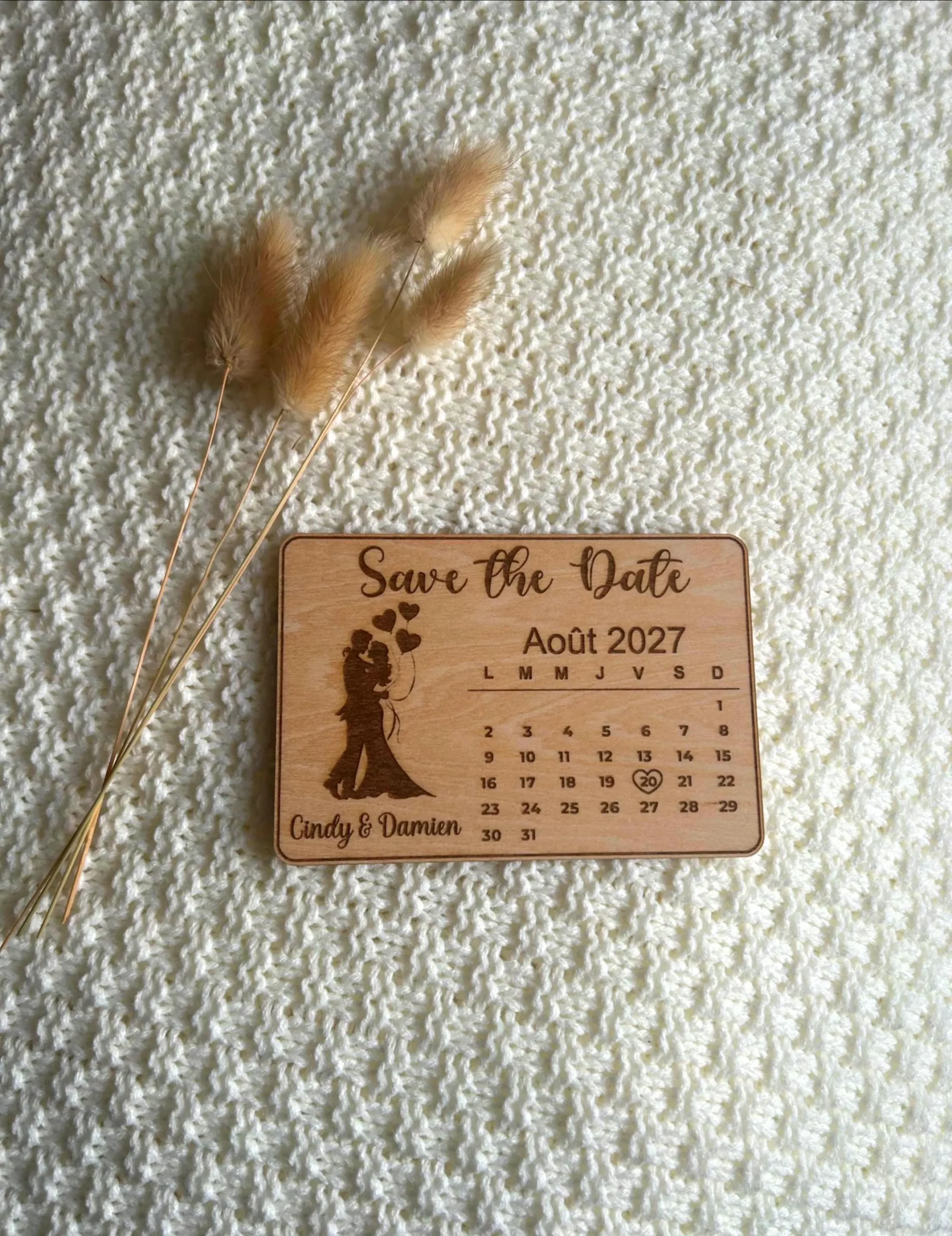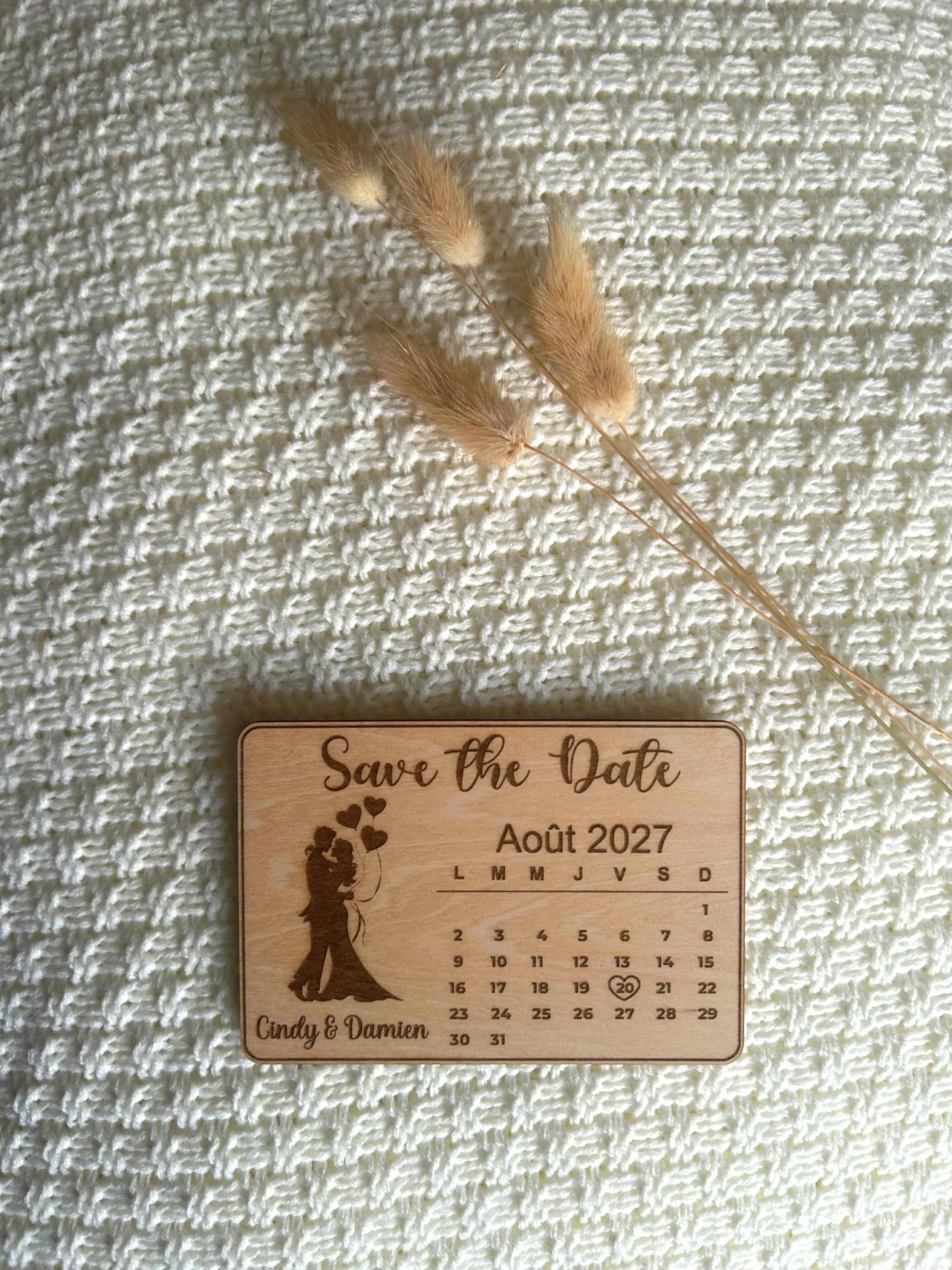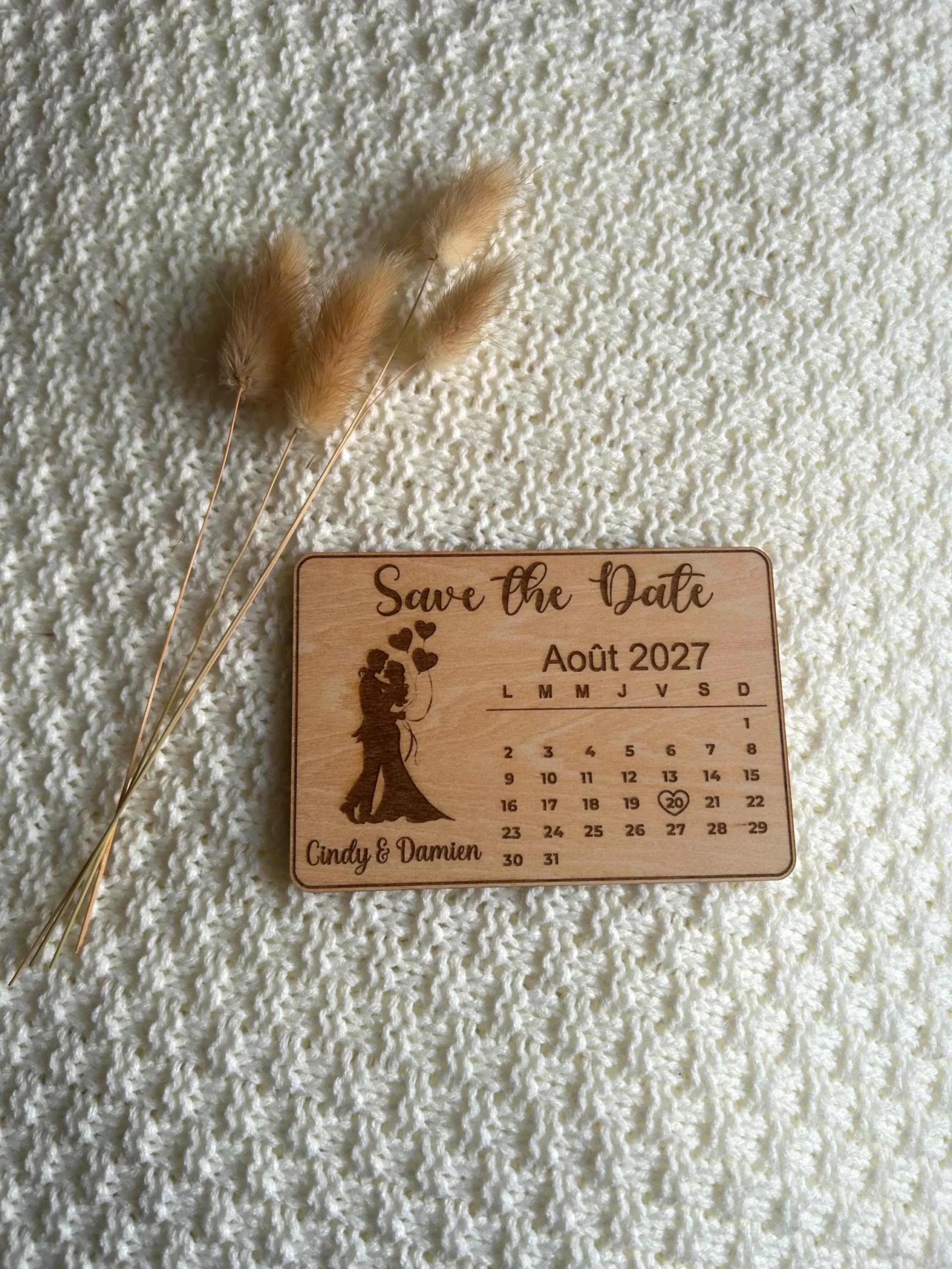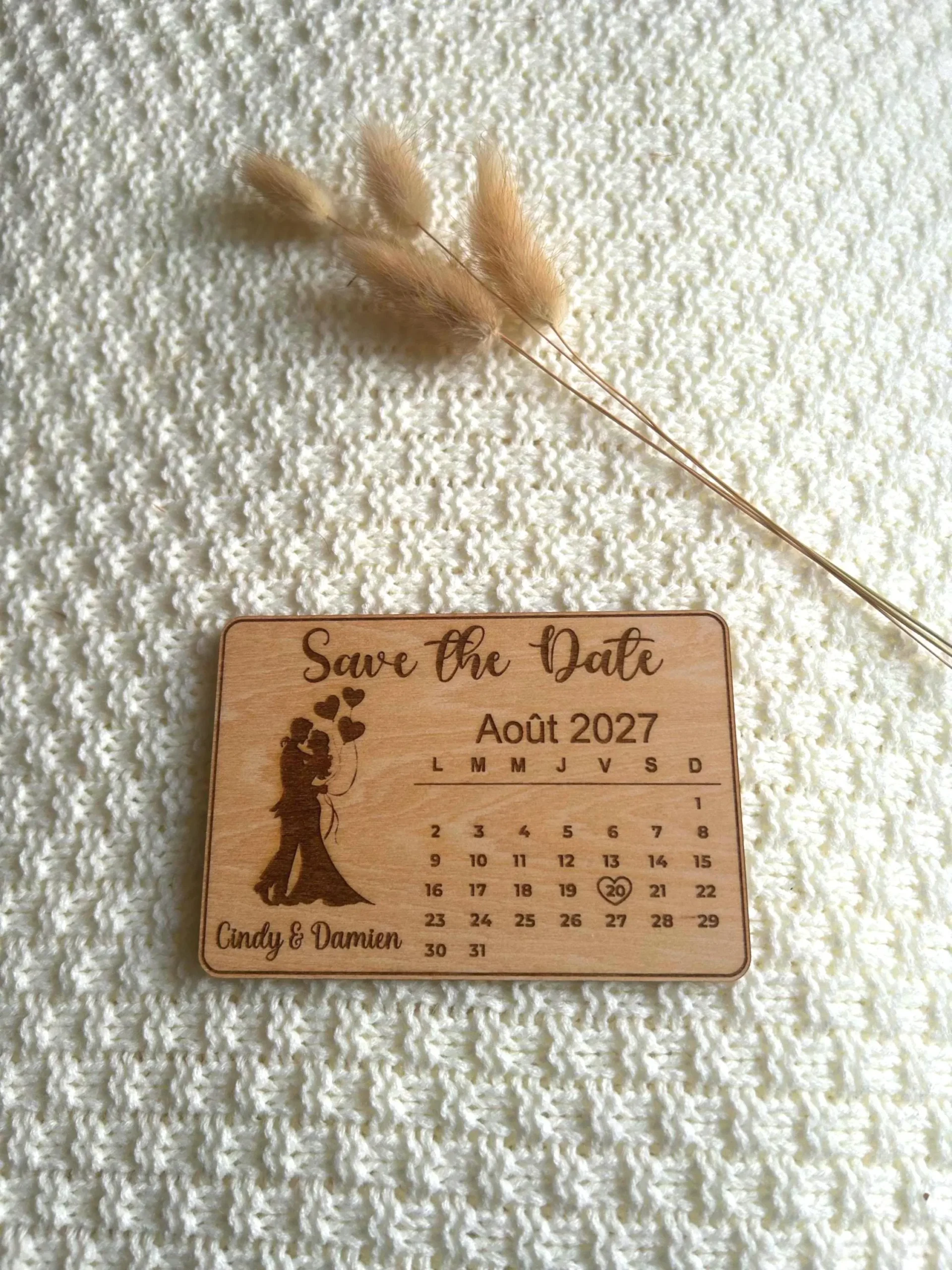 Chaque magnet est réalisé avec soin dans un bois chaleureux, offrant un rendu authentique et intemporel. La date de votre union est mise en valeur par un petit cœur gravé, accompagnée de vos prénoms pour une annonce unique et pleine de sens.